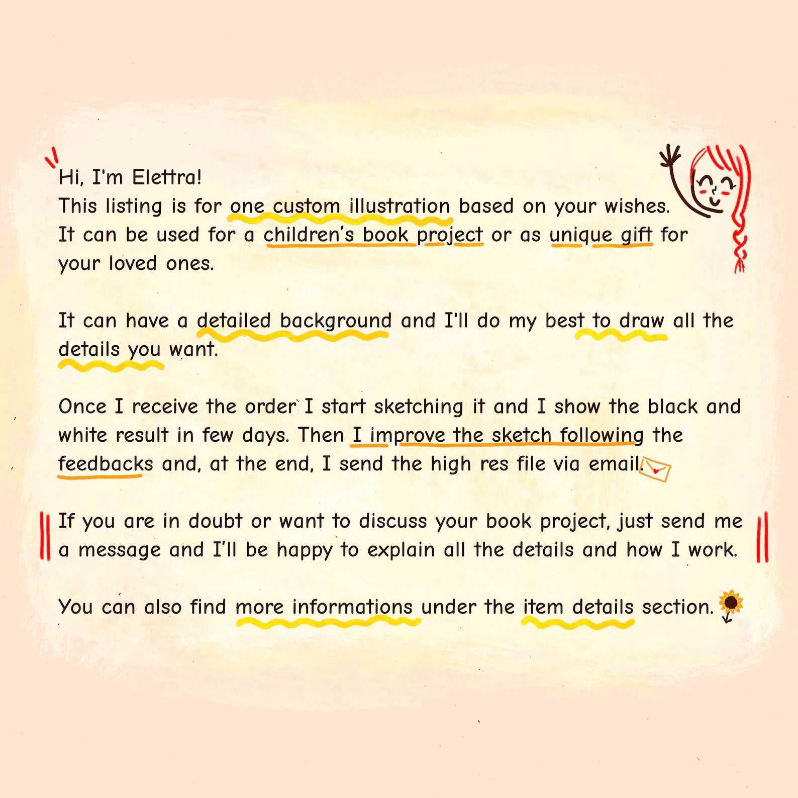 With my personal style I'll do my best to make one perfect custom illustration for you and your book project. If your book project requires multiple illustrations, I'd be happy to provide a detailed quote tailored to your specific needs. Just contact me here or to elettra90 [!at] gmail.com!
